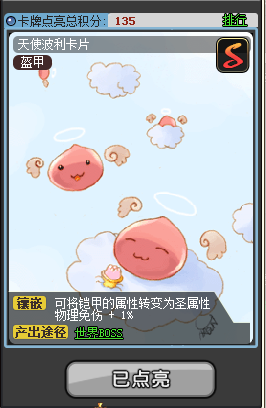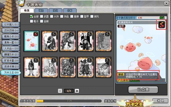 为了满足卡片收集爱好者的需求,研发团队隆重推出卡片收集系统。卡片等级从1星到5星,每收集到一个卡片,此卡片就会被点亮。当页的卡片全部被点亮后,即可点击“领取”获得游戏奖励。(获得相应的炫酷称号哦~),另外细心的童鞋,应该会发现点亮卡片会获得相应的积分,积分有排行榜哦~排行高低不等也会获得不同的奖励哦~