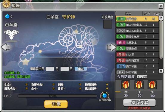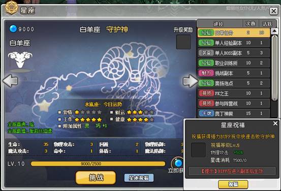 星座系统是一个集日常活跃、boss挑战、星座运势于一体的系统;