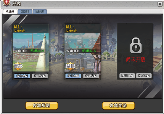 3、 攻城晚上20:00开始,同时开放吉芬、斐扬攻城战,持续时间1小时