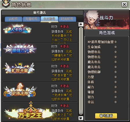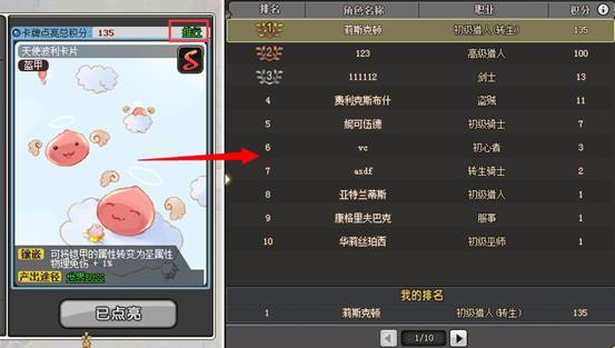 为了满足卡片收集爱好者的需求,研发团队隆重推出卡片收集系统。卡片等级从1星到5星,每收集到一个卡片,此卡片就会被点亮。当页的卡片全部被点亮后,即可点击“领取”获得游戏奖励。(获得相应的炫酷称号哦~),另外细心的童鞋,应该会发现点亮卡片会获得相应的积分,积分有排行榜哦~排行高低不等也会获得不同的奖励哦~