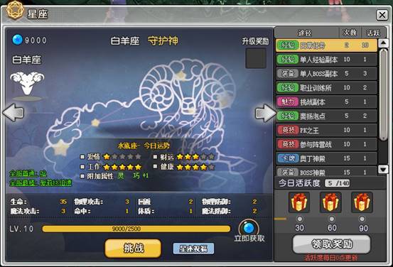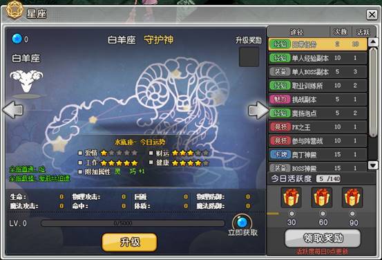 星座系统是一个集日常活跃、boss挑战、星座运势于一体的系统;